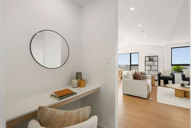 The master suite is also positioned upstairs, featuring a tiled wet-room ensuite and a thoughtfully arranged walk-in wardrobe. A study nook is neatly positioned before the master, providing a quiet corner for work or study, while a stylish powder room services the upper floor. Downstairs, the main bathroom continues the same sleek aesthetic, complemented by additional bedrooms including one with direct access to the patio"ideal as a second living space, guest room, or teen retreat.