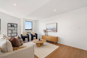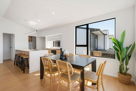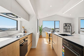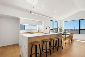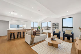 Elevated on the upper level, the main living spaces benefit from their vantage point across the surrounding streetscape. Raking ceilings add volume to the open-plan lounge and dining area, making the entire zone feel light, spacious, and inviting. The designer kitchen is a standout"its waterfall island, generous walk-in pantry, quality appliances, and abundant storage make everyday living effortless.